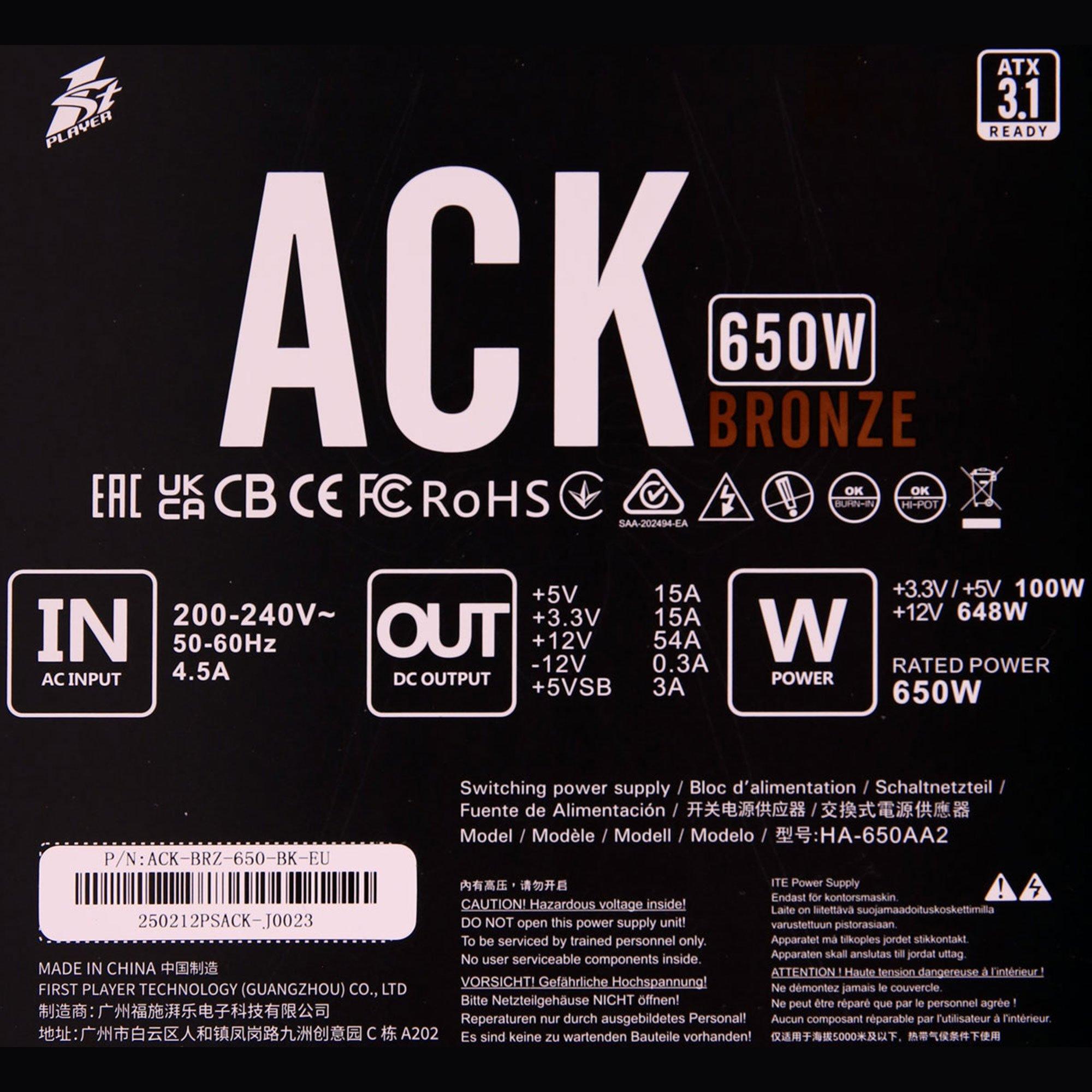 1stPlayer ACK Bronze 650W 80+ Bronze PSU New in 2years Warranty